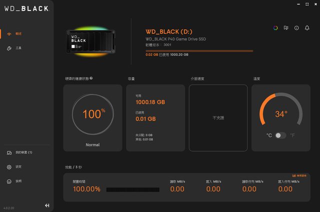 ●WD_BLACK Dashboard軟體(僅支援Windows)除了監控裝置狀態及效能外,還可自訂RGB