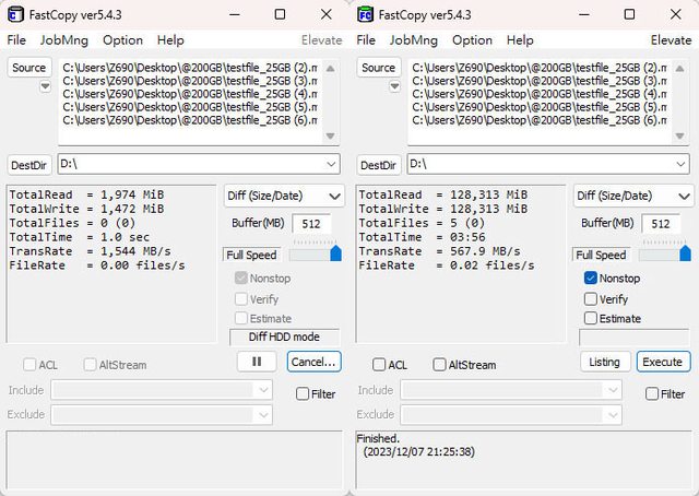 ▼第5次FastCopy複製,剩餘空間只能複製125GB資料,起始速度1472MB/s,結束速度