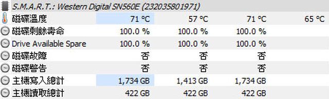 數據最高71度,紅外線熱影像顯示外殼背面溫度64度。使用USB-C to USB-A轉接頭連接至