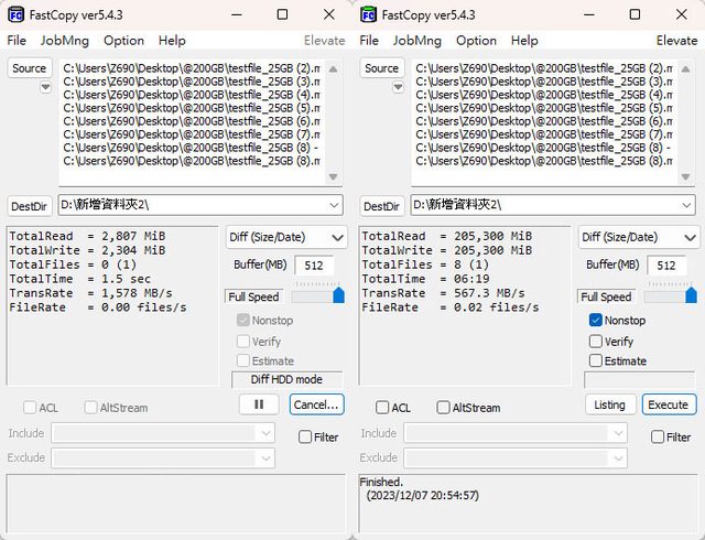 ▼第2次FastCopy複製,起始速度1578MB/s,結束速度567.3MB/s,耗時6分19秒