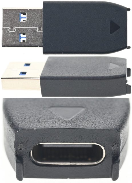▼USB-C to USB-A轉接頭於USB-C插座部分有2個凸出部,其中一面有三角形記號,尺寸