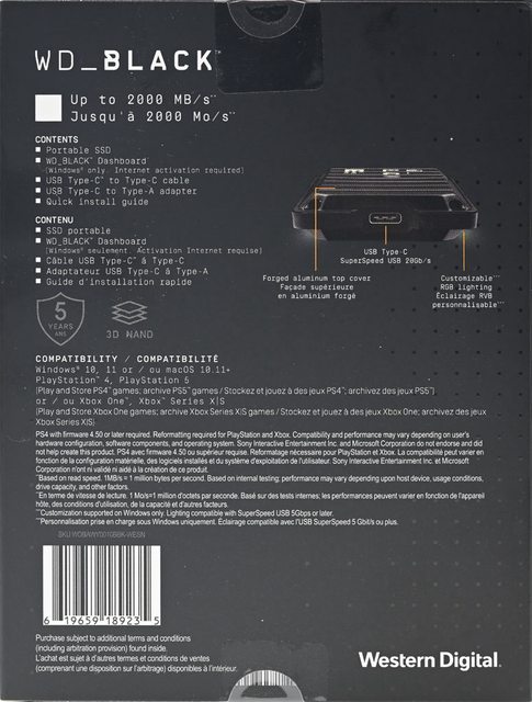 ▼外盒正面有WD_BLACK字樣、產品外觀、產品名稱、相容裝置、容量、最高速度