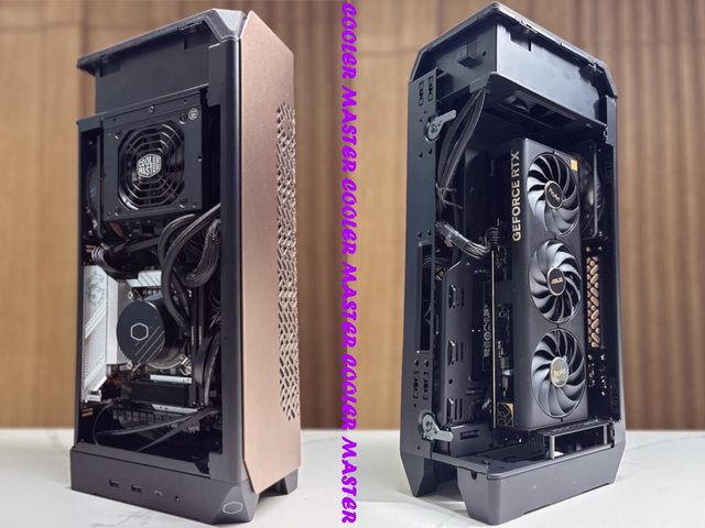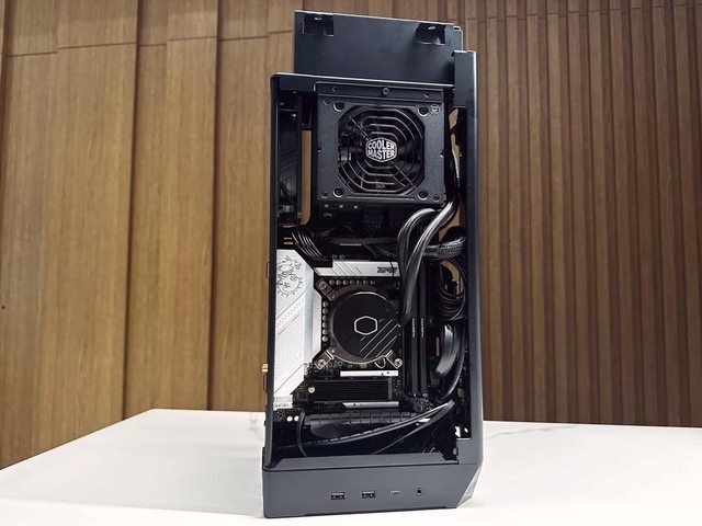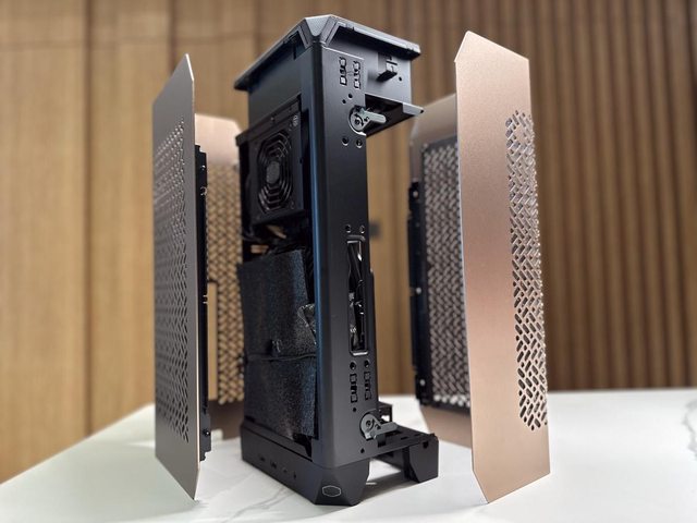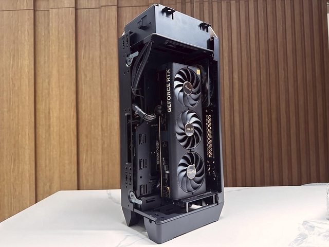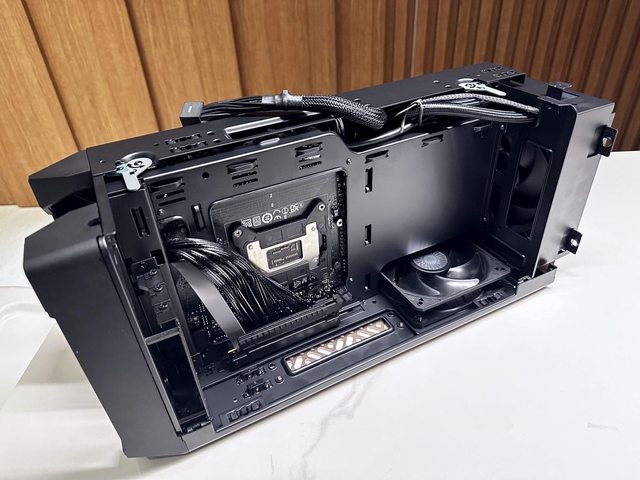 顯示卡與主機板為背對背安裝方式,各自從面板開孔進氣後,從頂部CPU一體水冷及側邊