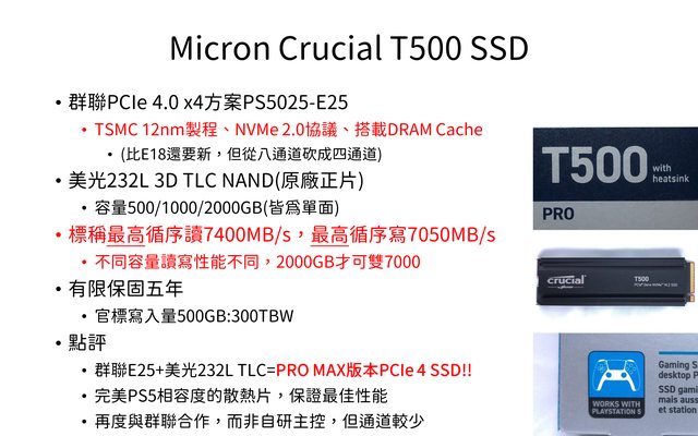 群聯和美光去年底合作推出PS5025-E25這款新品,首發為T500 SSD
