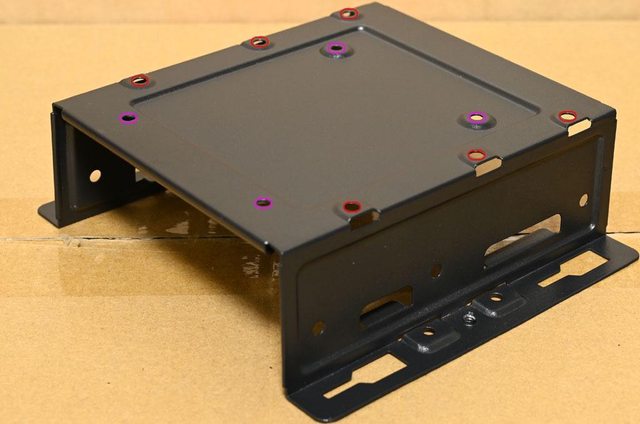 定架前要先取下水藍色框的2個螺絲,移除固定架後可直接在底部安裝3.5吋裝置(紅色孔)