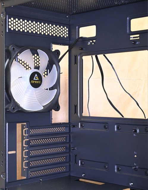 ▼後方預裝1個120mm ARGB主控風扇,主機板安裝底板上方鏤空,方便拆裝CPU散熱器背板