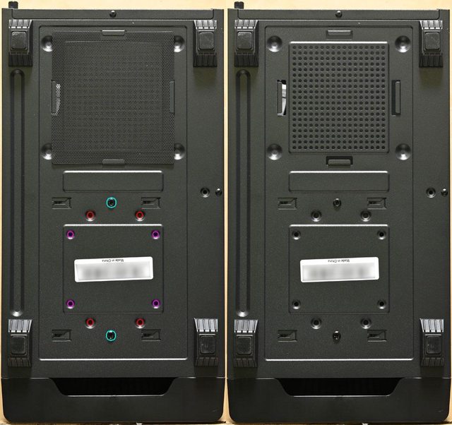 ▼機殼底部腳座有防滑墊,底部電源進氣口配置嵌入式過濾網。移除底部3.5吋/2.5吋固