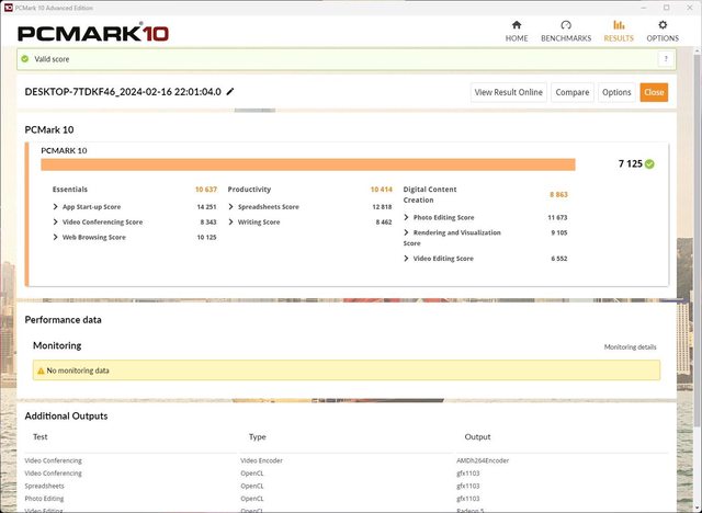 PCMARK 成績為 7125 。