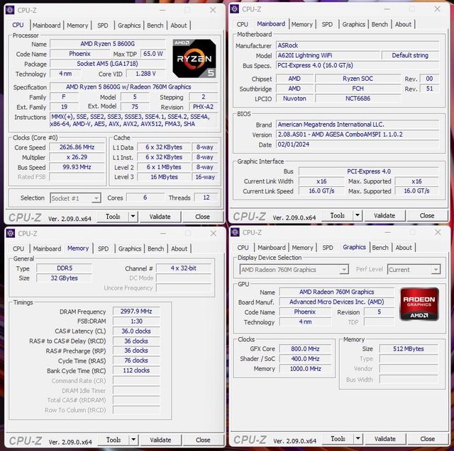 透過 CPU-Z 可以看到 8600G 的 GPU 為 AMD Radeon 760M 。而主機板的版本也確定提升