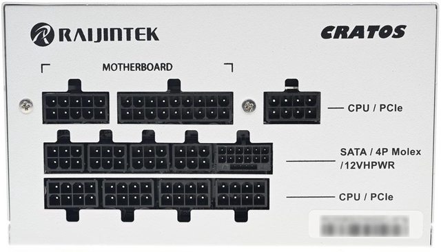 ▼黑色模組化線組輸出插座有名稱標示,左上方有RAIJINTEK商標,右上方有CRATOS名稱