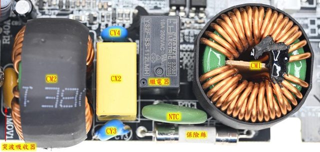 ▼主電路板上有2個共模電感(CM1/CM2)、1個X電容(CX2)及2個Y電容(CY3/CY4),2個共模