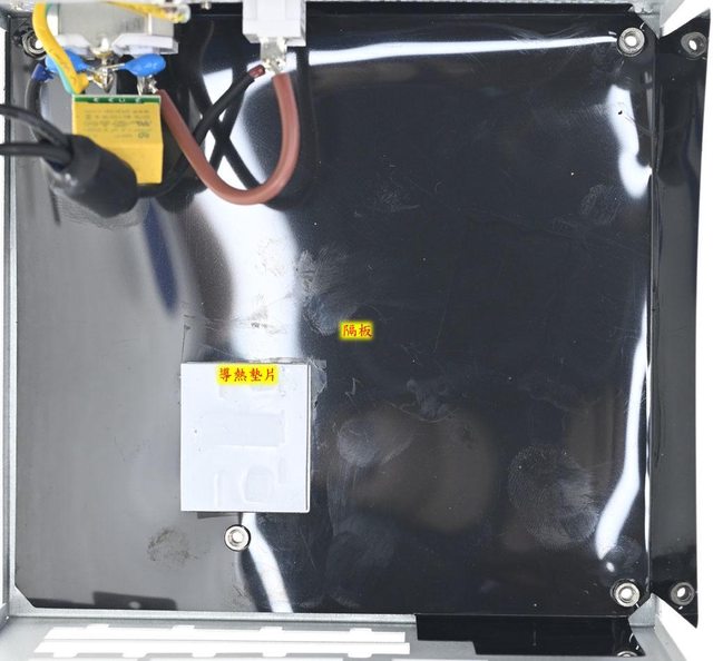 ▼外殼底部黑色隔板於主電路板二次側區域開孔並貼上導熱墊片