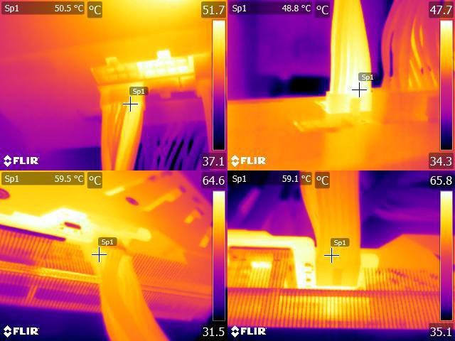 ▼執行FURMARK 30分鐘後電源端插頭(左上/右上)及顯示卡端插頭(左下/右下)的紅外線熱
