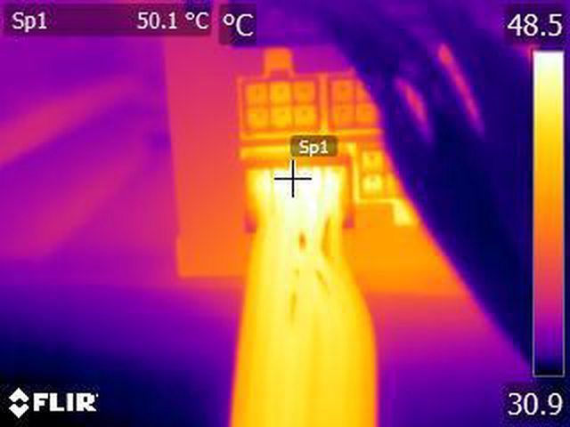 ▼單條PCIE 6+2P(雙頭)連續輸出21A(252W)10分鐘後的電源端模組化接頭紅外線熱影像圖