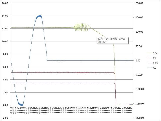 ○綜合全負載輸出狀態切斷AC輸入模擬電力中斷,12V於12ms開始出現波動,於23ms降至