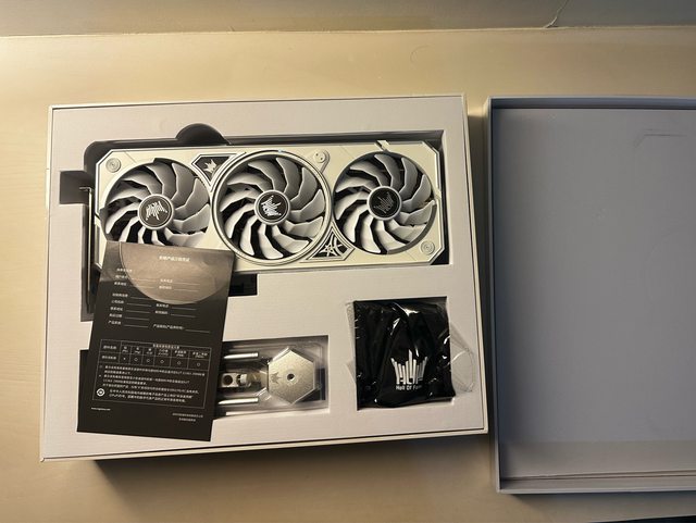 移除黑色廢紙後內容物上方為顯卡本體,下方由左至右依序為顯卡支架、轉接供電線、5v