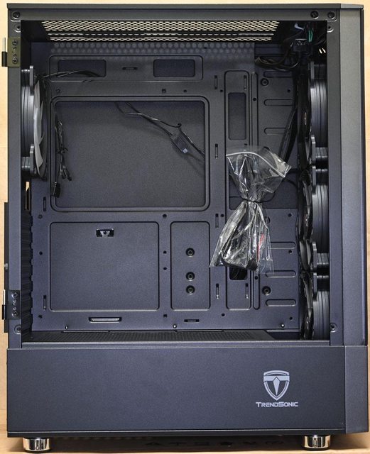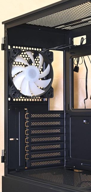 方預裝1個120mm ARGB風扇。前方可裝360mm一體式水冷散熱排,頂部可裝240mm一體式水