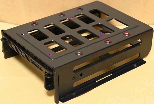 ▼底部3.5吋/2.5吋固定架頂部有3.5吋裝置(紅色框)及2.5吋裝置(紫色框)固定孔,內部