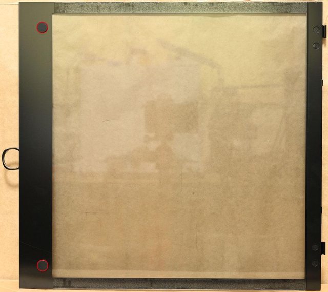 ▼強化玻璃背面左側有2個磁吸固定磁鐵(紅色框),右側邊緣配置轉軸金屬條
