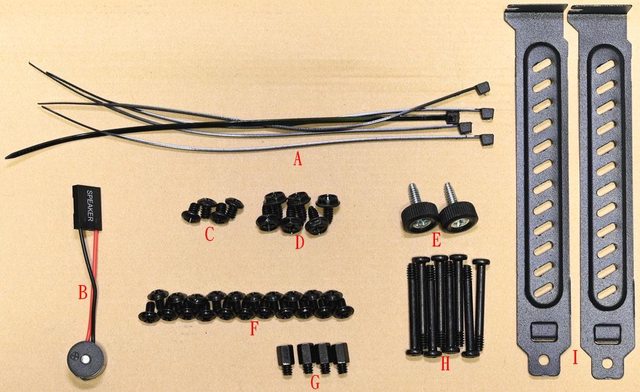 ▼隨附配件有塑膠束帶(A)、蜂鳴器(B)、3.5吋裝置螺絲(C)、電源/擴充槽螺絲(D)、備用