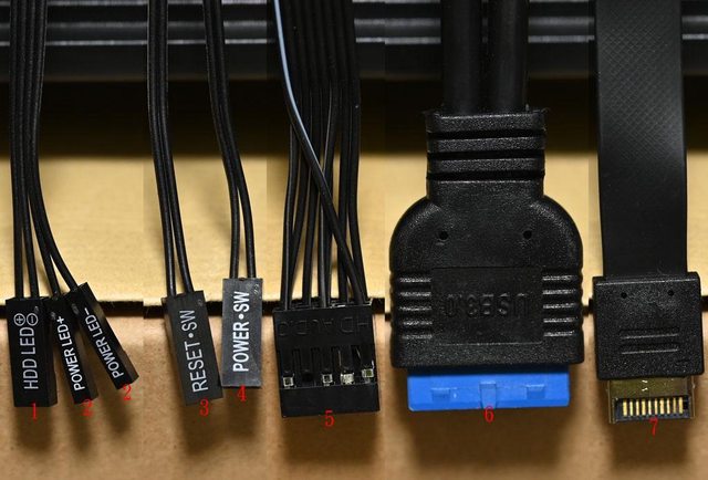 為電源開關接頭,5為耳機/麥克風插座接頭,6為USB3.2 Type-A主機板接頭,7為USB3.2