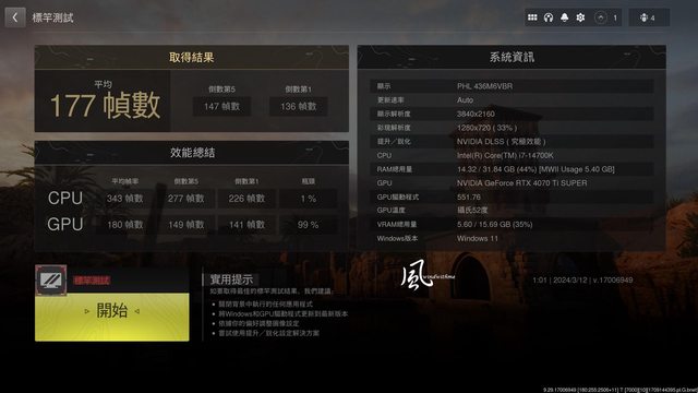 4K開啟DLSS 平衡 => 平均幀數 134;究極效能=> 平均幀數 177,幀數增加約53.3%與
