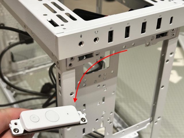 但這個翻轉需要拆除不少螺絲。一種是將配件提供的開機及重啟按鍵小面板拆下,裝在
