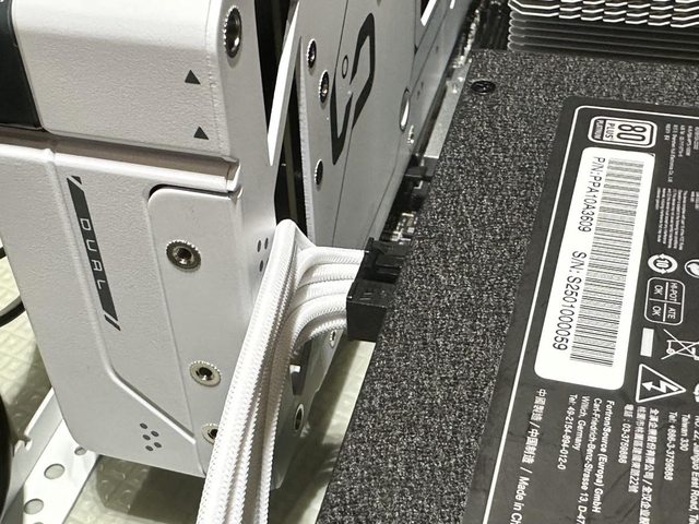 完成裝機的樣貌參考,因為白色訂製線長度係針對ATX機殼設計,所以長度略長,需要較