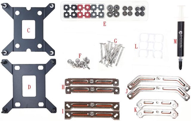 、LGA1200/115x/20xx托架(I)、AMD長托架(J)、AMD短托架(K)、水冷管固定扣(L)、散熱