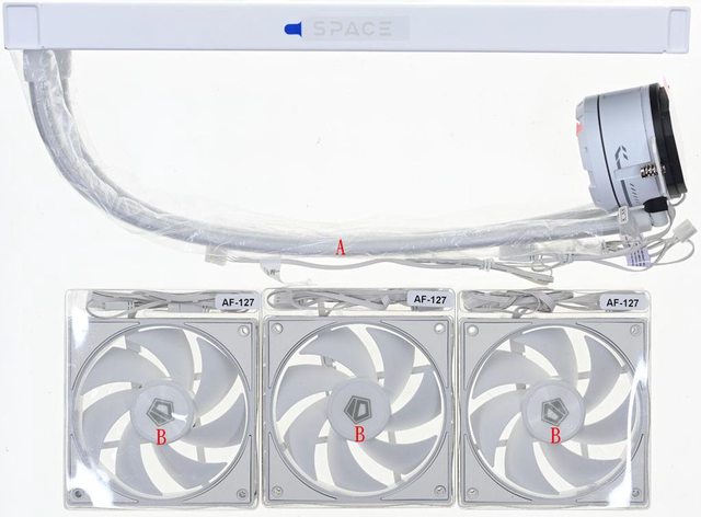▼包裝內容有SL360一體式水冷本體(A)及裝在透明盒內的AF-127-ARGB發光風扇(B)