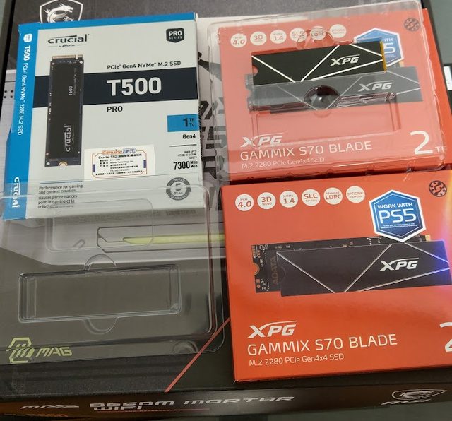 新買美光T500 1T 無散熱片版 時價2799 旁邊威剛其中一個是舊空盒