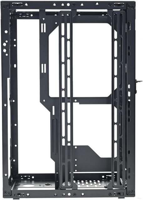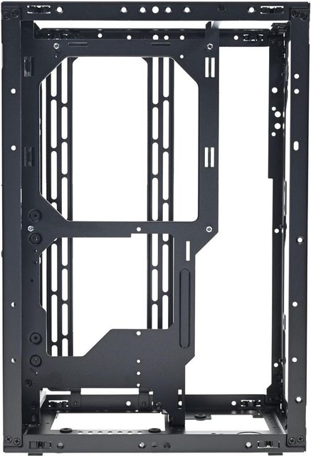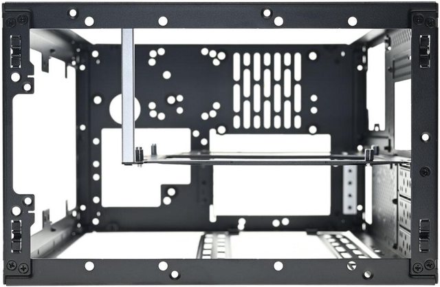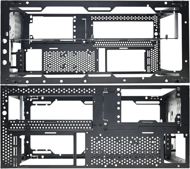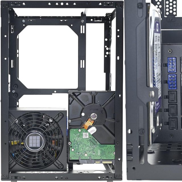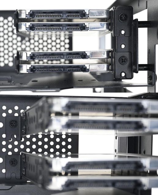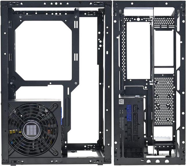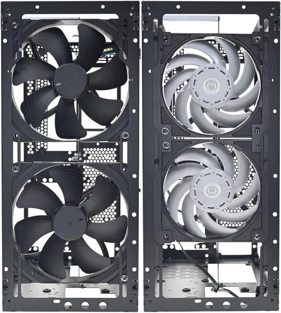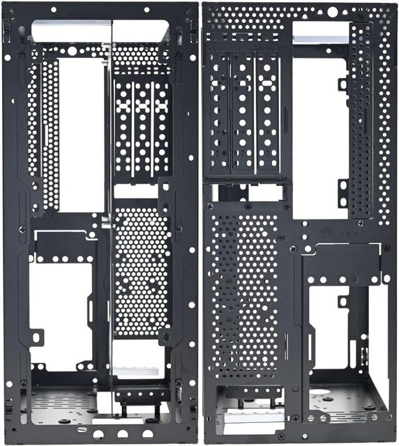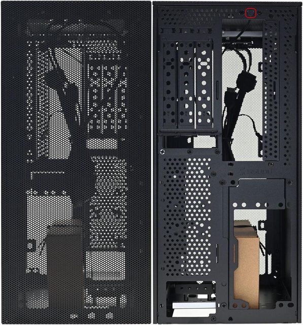 ▼拆除網孔板後的機殼前方(左)與後方(右)圖,內部預設配置為3槽模式