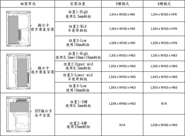 124mm,搭配額外腳座下長335mm寬124mm;3槽(63mm)顯示卡後方垂直安裝下長332mm寬