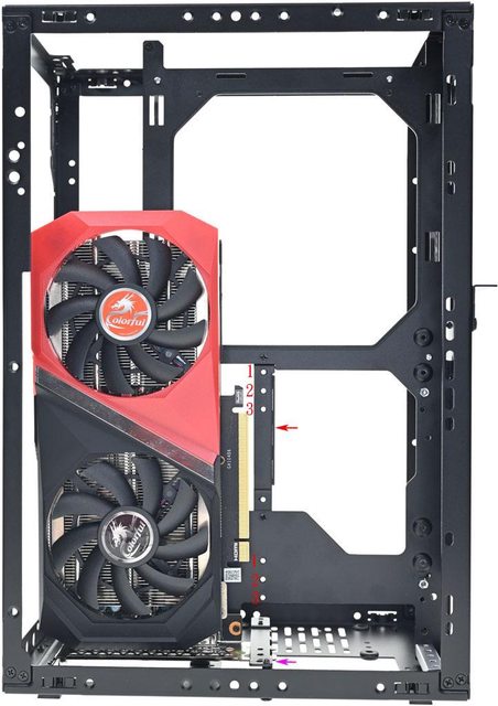 紫色箭頭)同樣需要依照顯示卡前方垂直安裝位置進行調整。位置1-High在擋板頂部固定