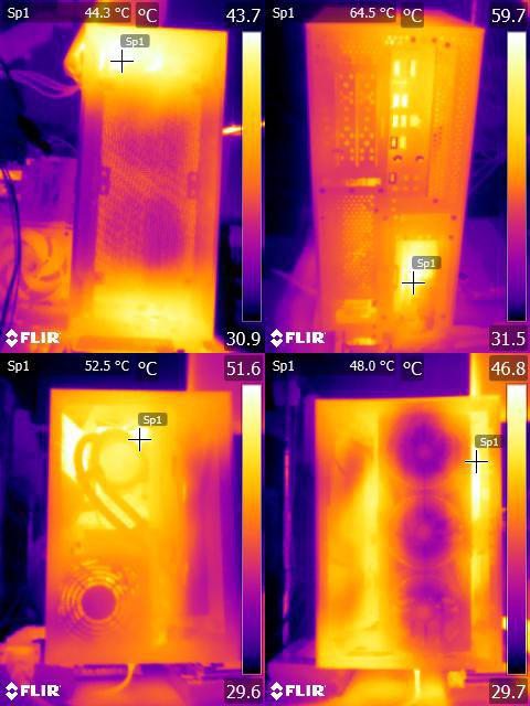 ▼CPU+GPU高負載30分鐘後的機殼前方(左上)/後方(右上)/左側(左下)/右側(右下)紅外線