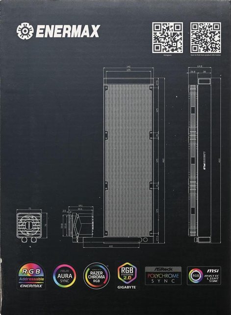▼外盒左側面有商標、Instagram/更多產品資訊QR碼連結、水冷頭/水冷排尺寸圖、支援