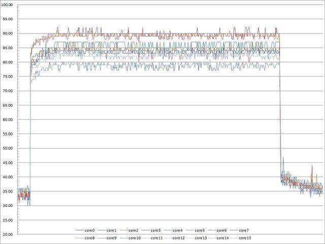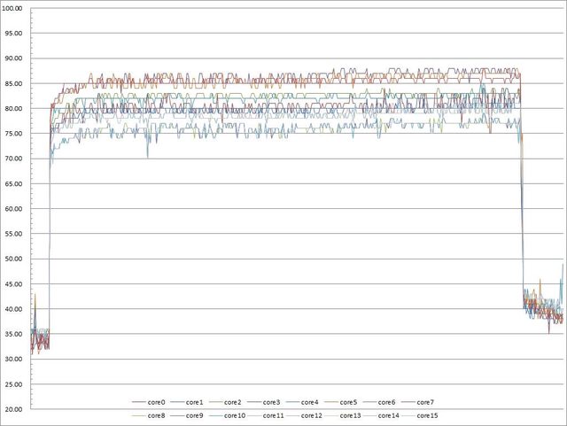 ▼功耗限制240W下高負載30分鐘CORE TEMP溫度記錄圖