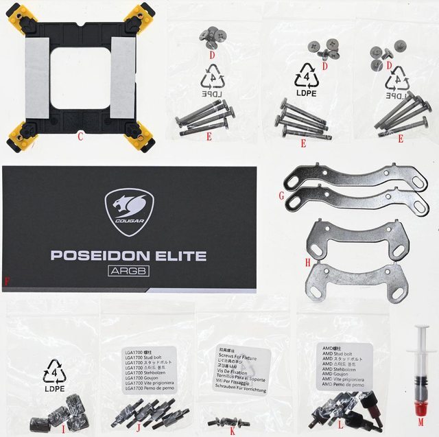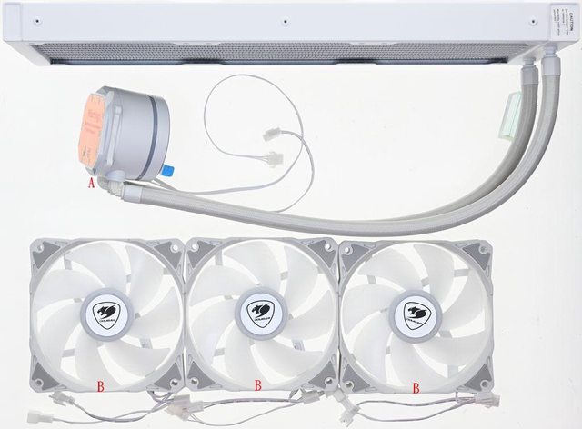 ▼包裝內容物有COUGAR POSEIDON ELITE ARGB 360 WHITE一體式水冷散熱器(A)、3個