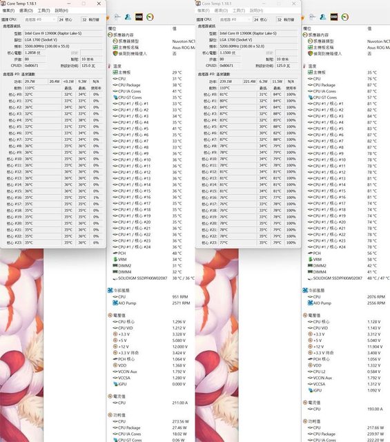 ▼功耗限制240W下待機(左)及高負載(右)的CORE TEMP及AIDA64感測器畫面