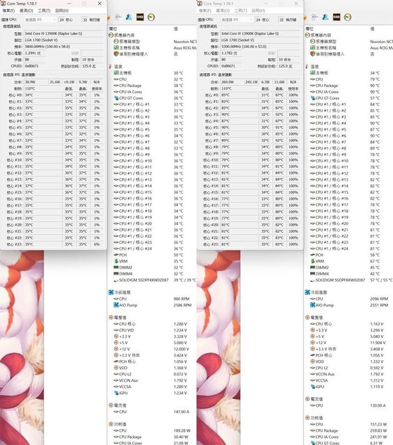 ▼功耗限制260W下待機(左)及高負載(右)的CORE TEMP及AIDA64感測器畫面