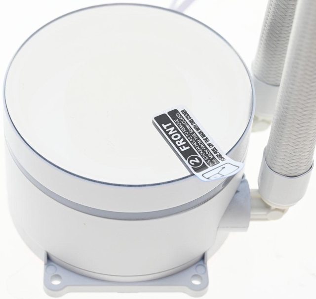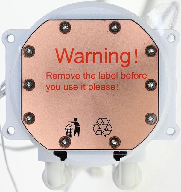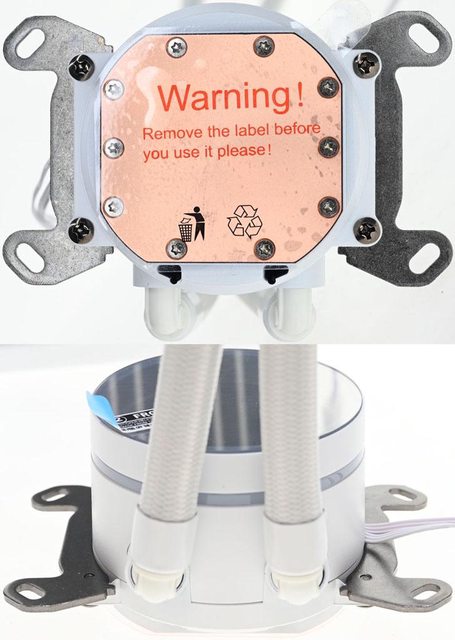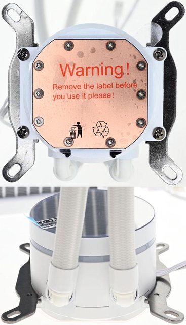 ▼水冷頭兩側有托架固定孔,處理器接觸面有一層透明保護貼,上面印上"警告!請在使