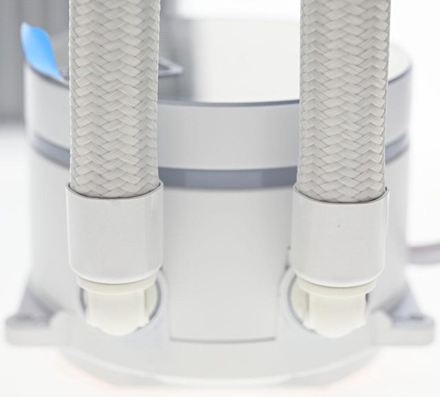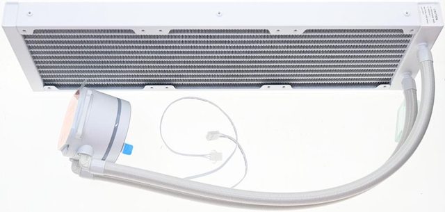 ▼鋁製水冷排尺寸392×121×27.5mm,進/出水管位於同一側,水管包覆白色編織網,編