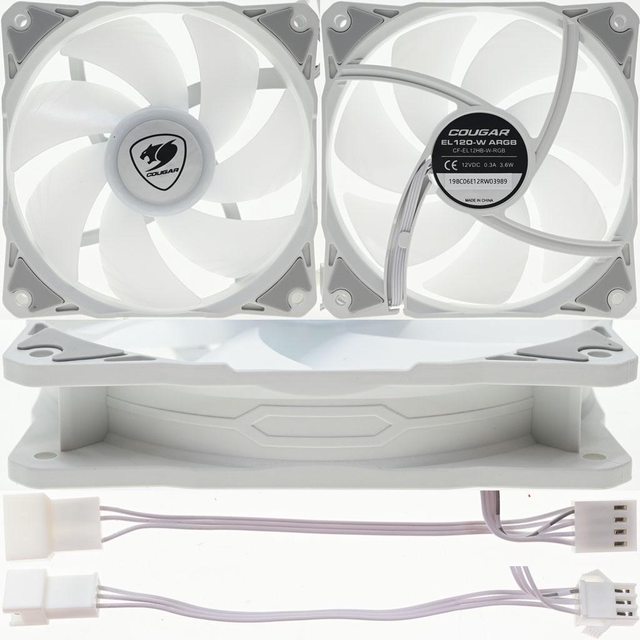 ▼隨附3個EL120-W ARGB風扇,型號為CF-EL12HB-W-RGB,7葉片乳白色扇葉軸心處有商標