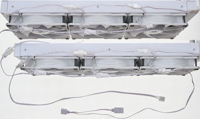 扇,風扇採用菊鏈串接設計。水冷頭頂蓋鏡面面板內部有發光標誌、無限反射鏡及光環,