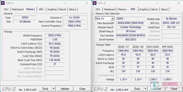 CPU-Z 規格資訊,左圖可以看到總容量為 32GB (16GB x 2),右圖顯示資訊使用 SK-Hynix