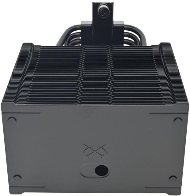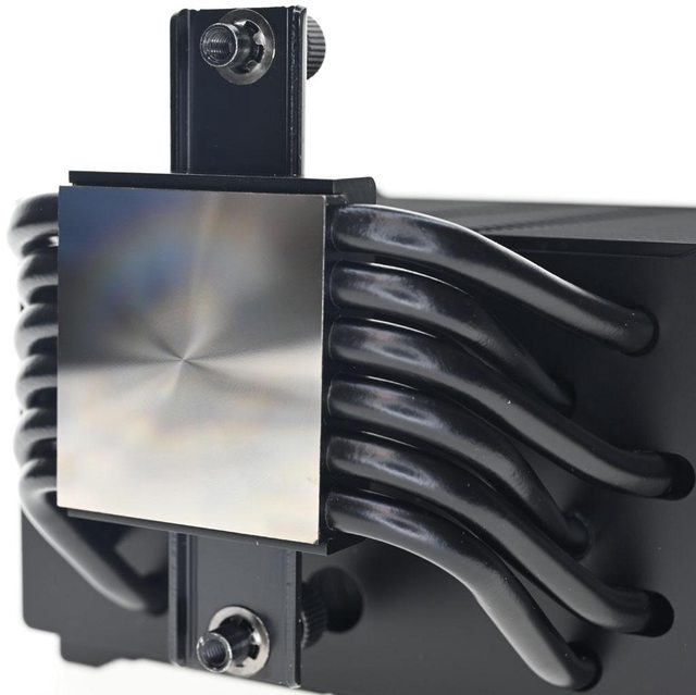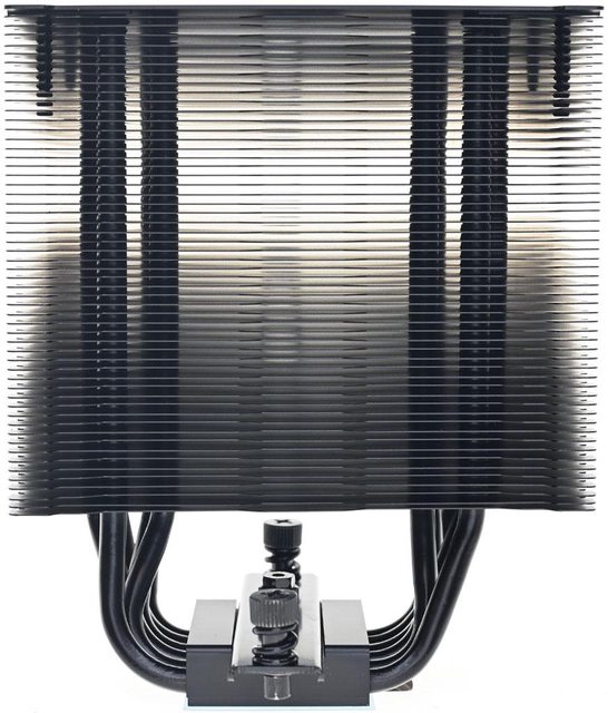 ▼散熱器採單塔設計,底座左右各伸出6支直徑6mm熱導管,裝上55片鰭片,頂部厚度較厚