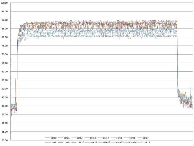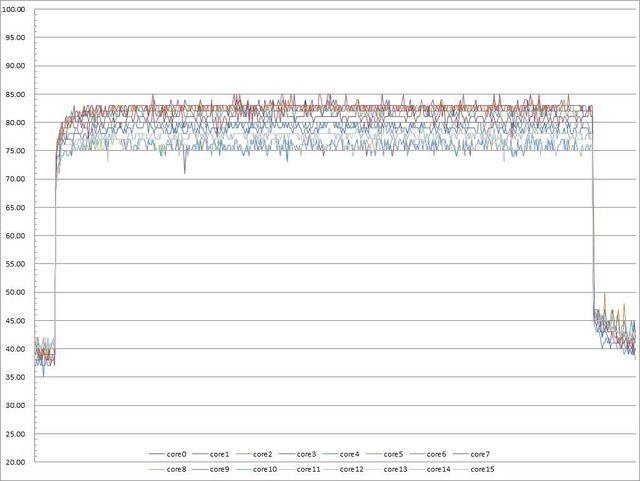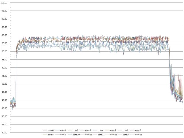 ▼功耗限制220W下高負載30分鐘CORE TEMP溫度記錄圖