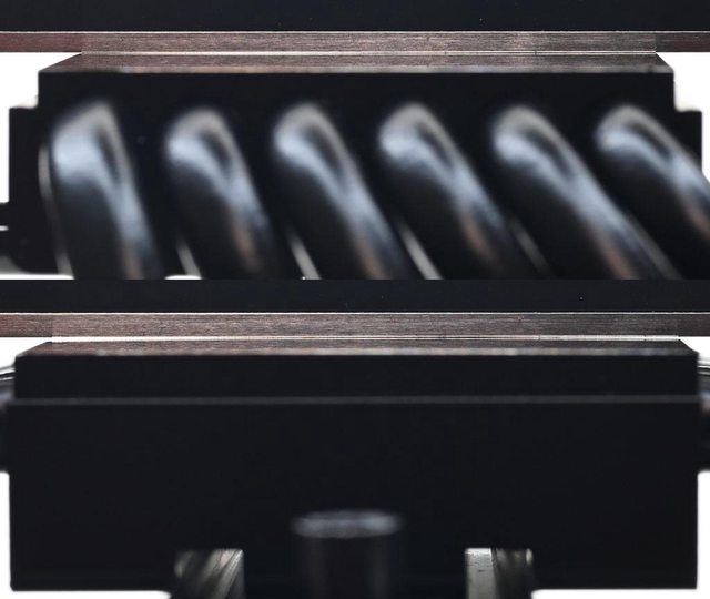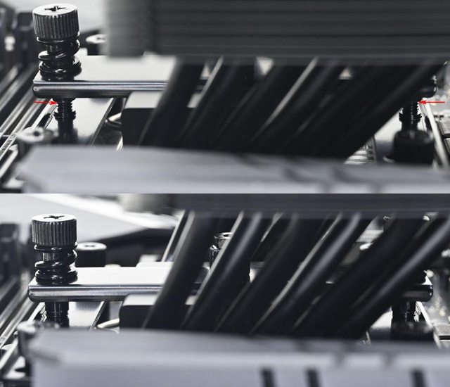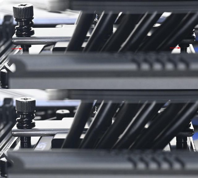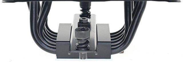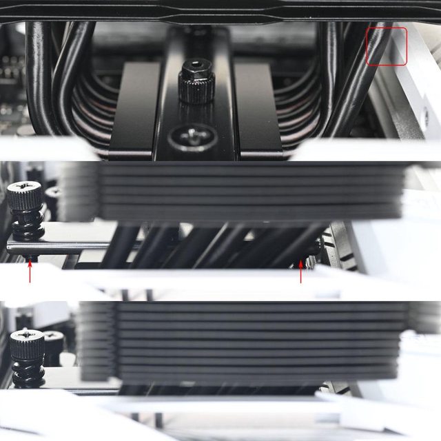 ▼壓板兩邊設置鎖在托架上的彈簧螺帽,中間用1個螺絲固定在散熱器底座頂部