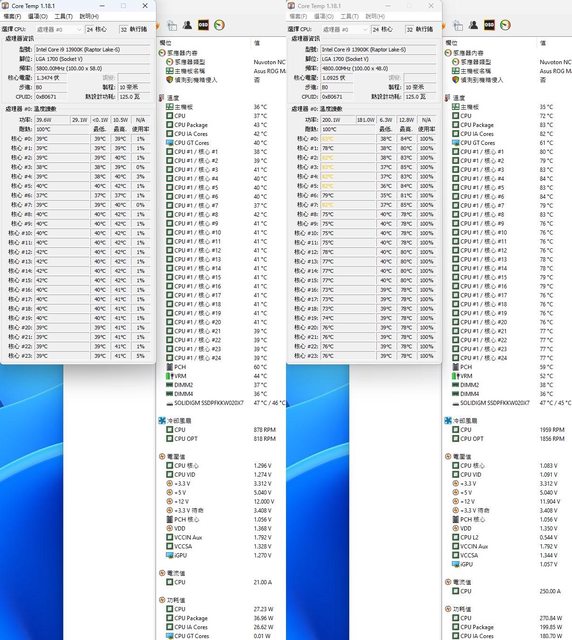 ▼功耗限制200W下待機(左)及高負載(右)的CORE TEMP及AIDA64感測器畫面