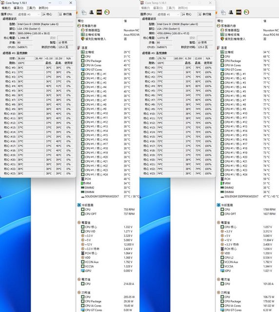 ▼功耗限制180W下待機(左)及高負載(右)的CORE TEMP及AIDA64感測器畫面